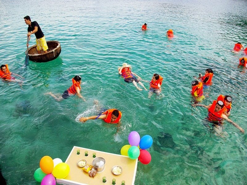 7h50: đến Đảo, lên Nhà bè, nhận ghế, bàn để hành lý, tự do tắm biển, lặng ngắm san hô, chơi dù lượng (tự túc phí). Tại đây đoàn có thể ngồi câu cá, câu mục giữa biển và nhâm nhi ly rượu ấm nồng với sản phẩm mình bắt được, đoàn giao lưu chương trình Karaoke với âm thanh mang theo phục vụ đoàn.